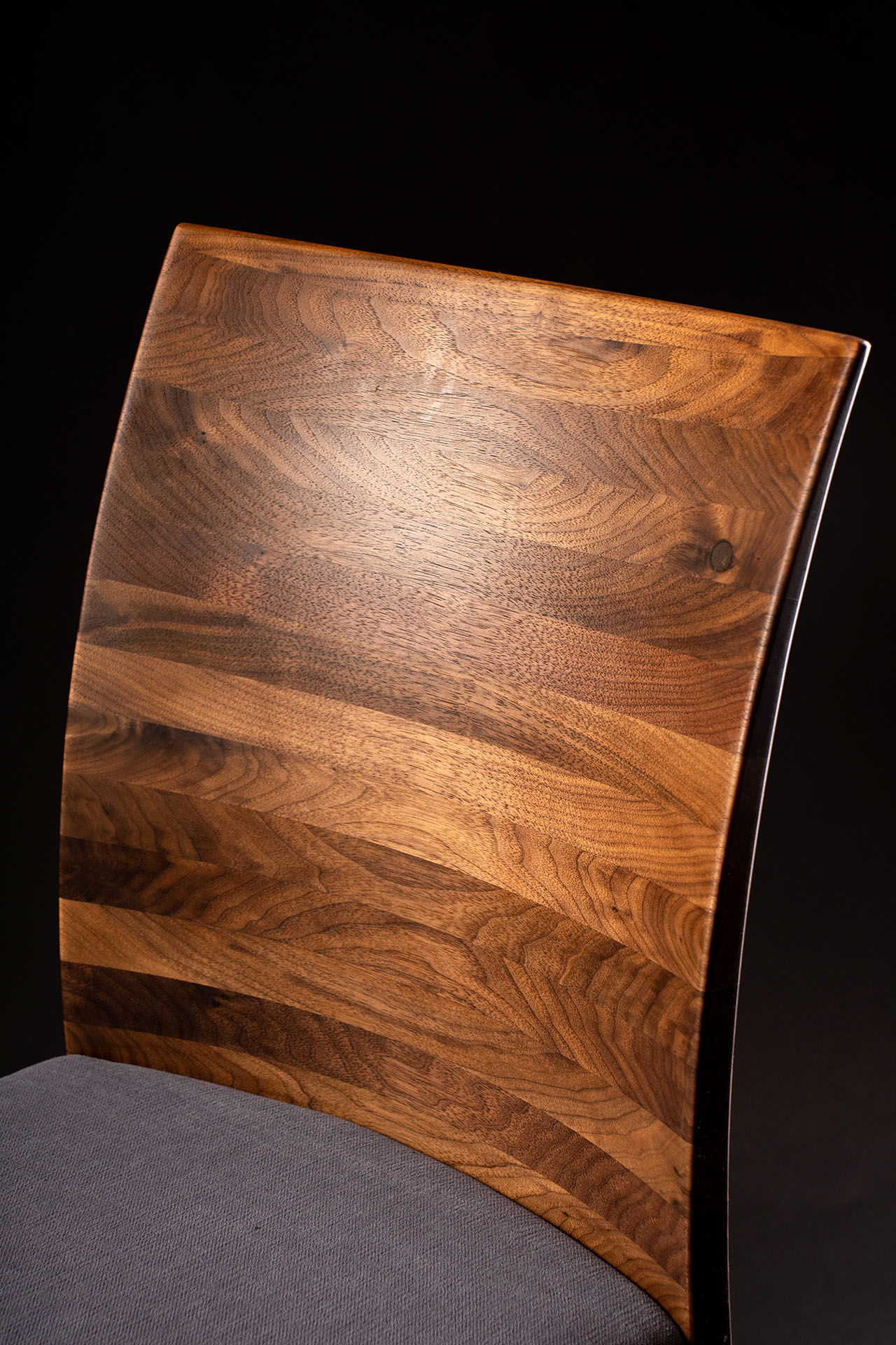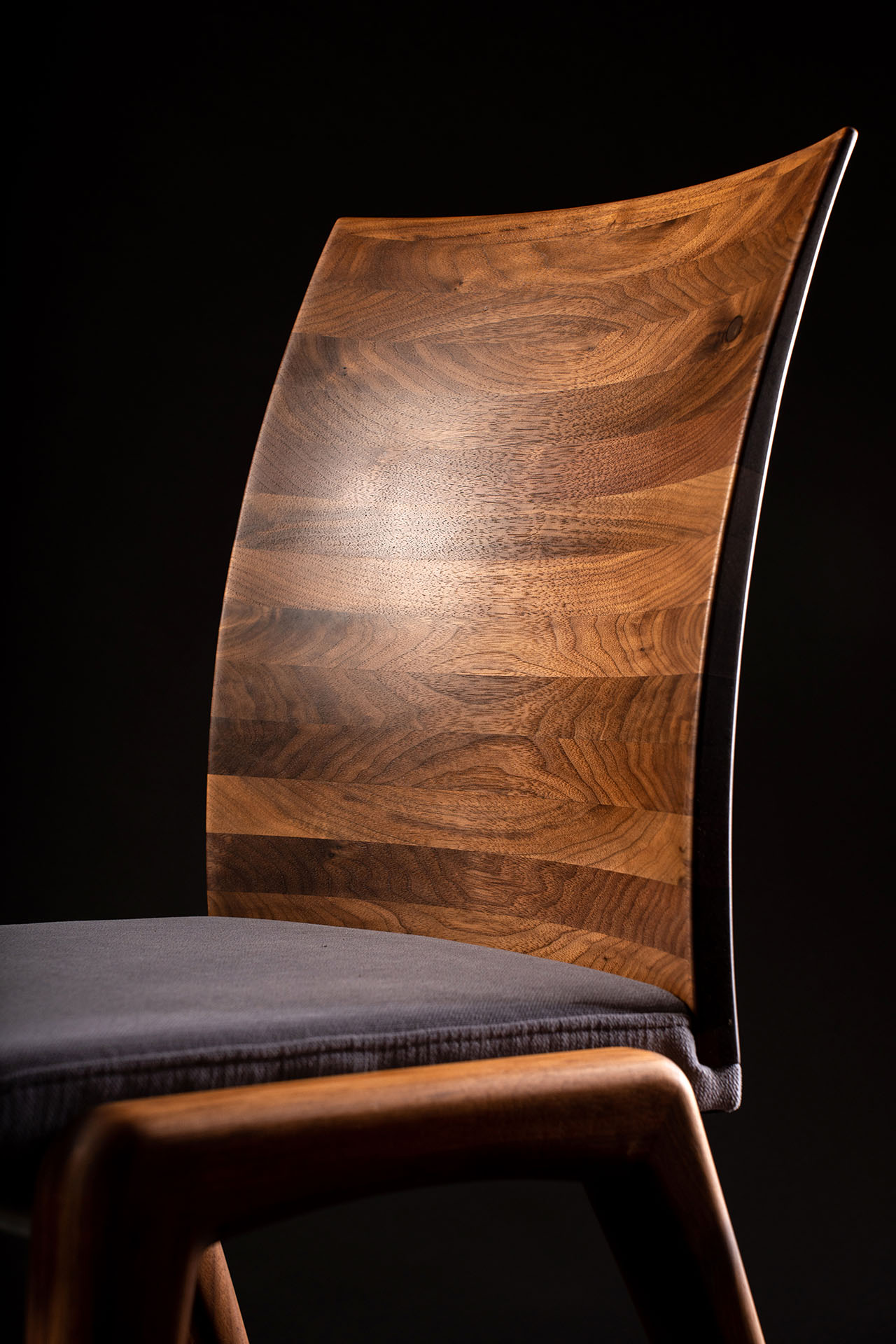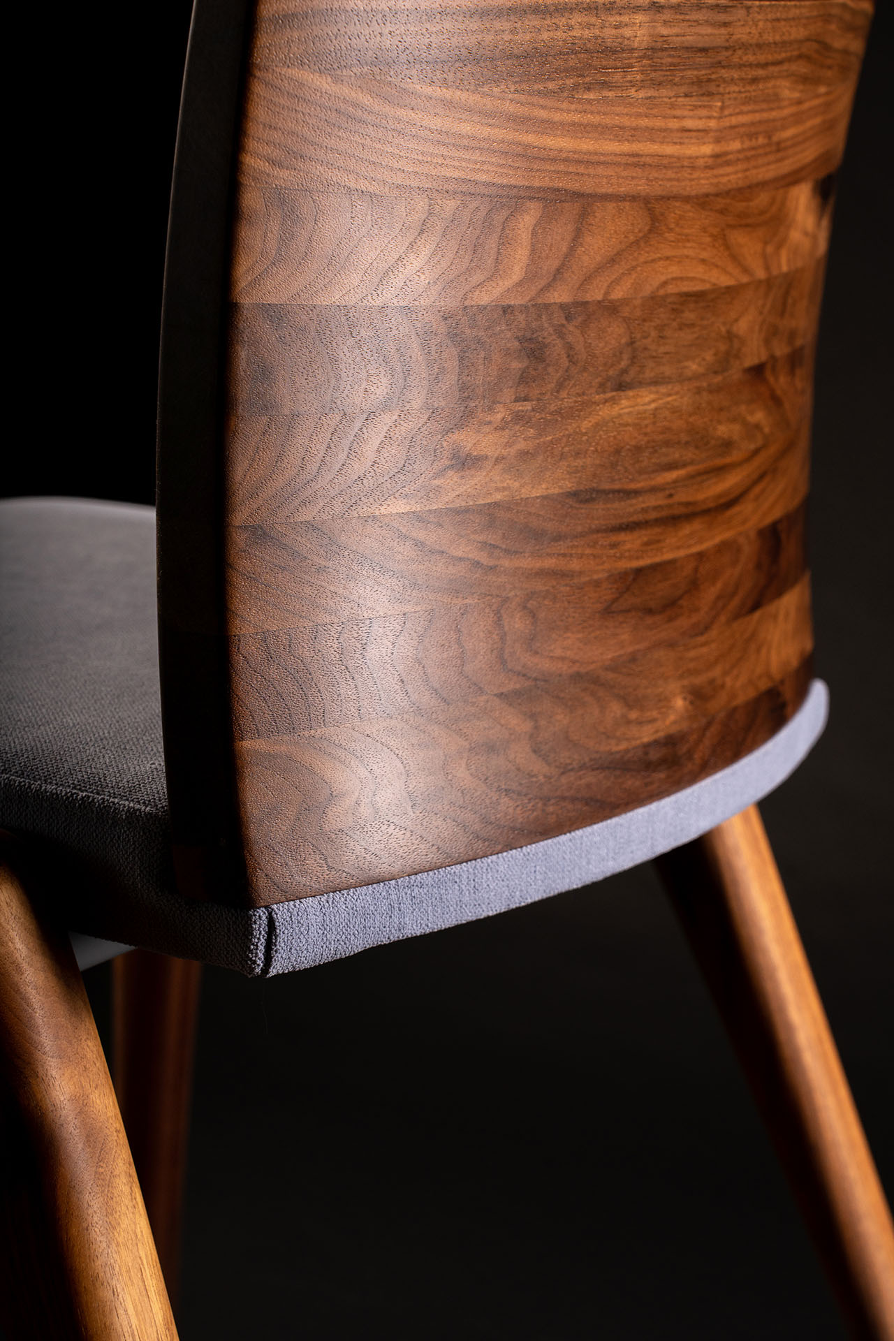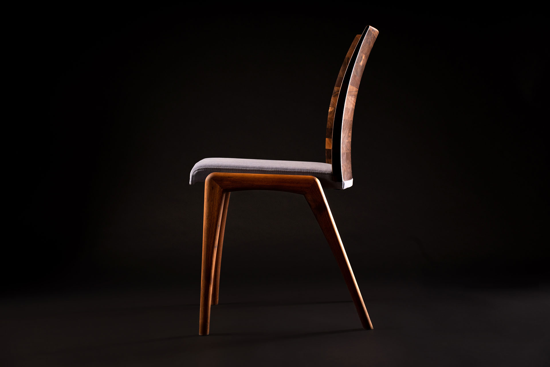 Tömörfából készült design szék tömör fa háttámlával szövet vagy bőr kárpitozással, tölgy vagy diófa kivitelben is elérhető.